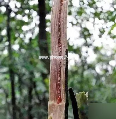 然而,一旦它较粗的枝条破损,或者折断后。神奇的事情就会发生啦!断裂处先是缓缓流出透明汁液,起先并不显眼,但不多久,颜色就会变成血红色,好像流过鲜血似的。捏一捏树芯部位软软的,好像一条“血管”,液体还有点黏稠。