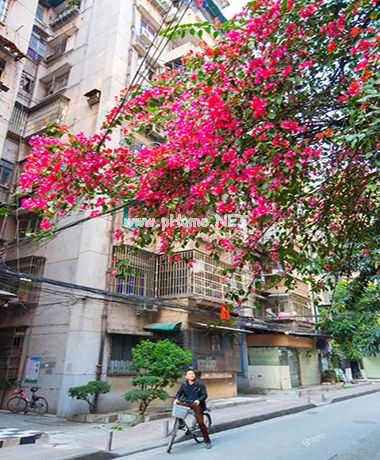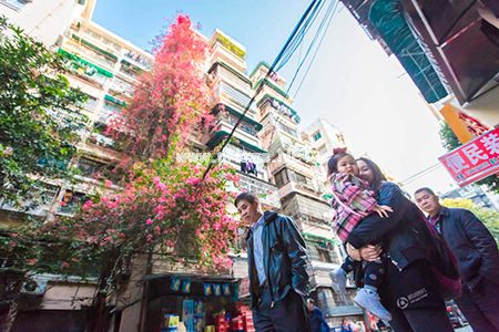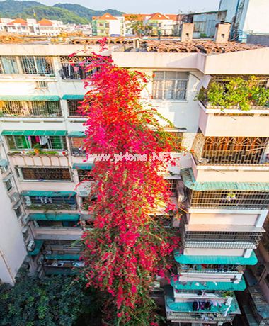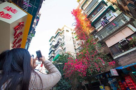 如今花枝已攀爬至第九层楼顶,粉色的簕杜鹃“瀑布”倾泻而下,街坊们每每路过都要驻足欣赏、拍照留影。