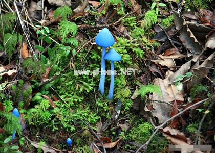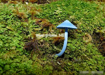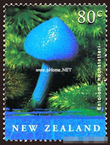 这种蓝色蘑菇主要分布于新西兰北岛和南岛西部的树林里,被誉为爱丽丝仙境的产物,但是可是有毒的。新西兰2002年发行的真菌邮票系列中就专门为蓝色蘑菇做了一个版面。