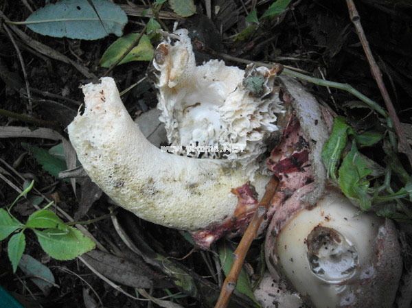 当他们从地上拿起看了一下发现这种菌类其实底下是由柱状生长出来的,顶部呈现椭圆半球状,队中有驴友看到后赶紧劝他们放下,因为这种未知的菌类不知是否会有毒。