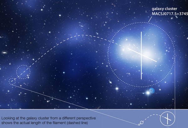 最大宇宙透镜 星系团J0717.5+3745是最大的宇宙透镜,也是最拥挤的星系团,被描述为“宇宙自由竞赛”,距离地球54亿光年。其透镜效应可用于研制宇宙中拥有质量却不释放射线的天体。